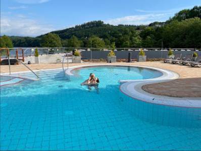 Mal keine Riesenhalle mit dröhnender Lautstärke, sondern viele kleine Sitzbereiche und Liegen, die sehr gut verteilt sind. Schöne Kinderbecken und auch ein sehr einladendes Außenbecken mit Sole und schöner Aussicht auf die Biggetalsperre.